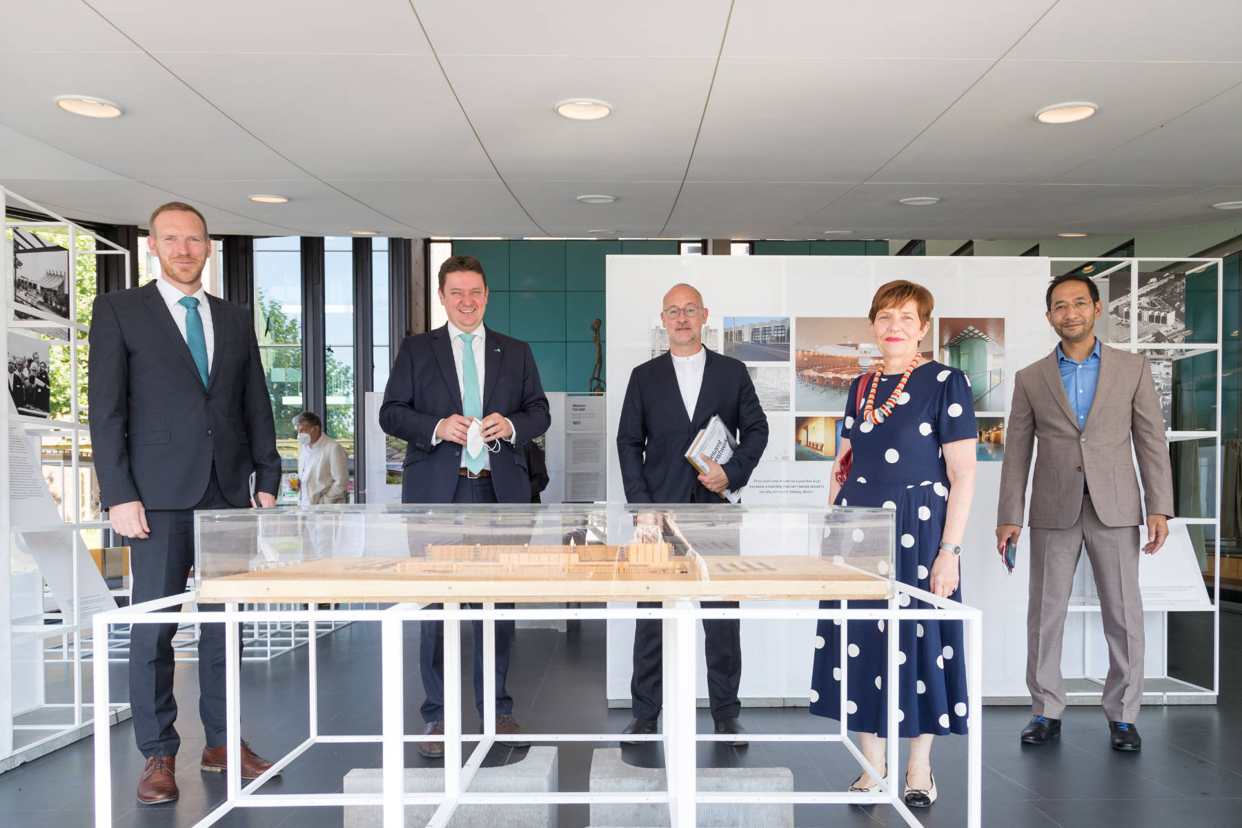 Von links nach rechts: Dr. Jan Heinisch (Staatssekretär, Ministerium für Heimat, Kommunales, Bau und Gleichstellung des Landes Nordrhein-Westfalen), Rajko Kravanja (Bürgermeister Castrop-Rauxel), Hendrik Bohle (THE LINK, Kurator der Ausstellung), Dr. Ursula Kleefisch-Jobst (Generalkuratorin des Museums der Baukultur Nordrhein-Westfalen) und Jan Dimog (THE LINK, Kurator der Ausstellung).