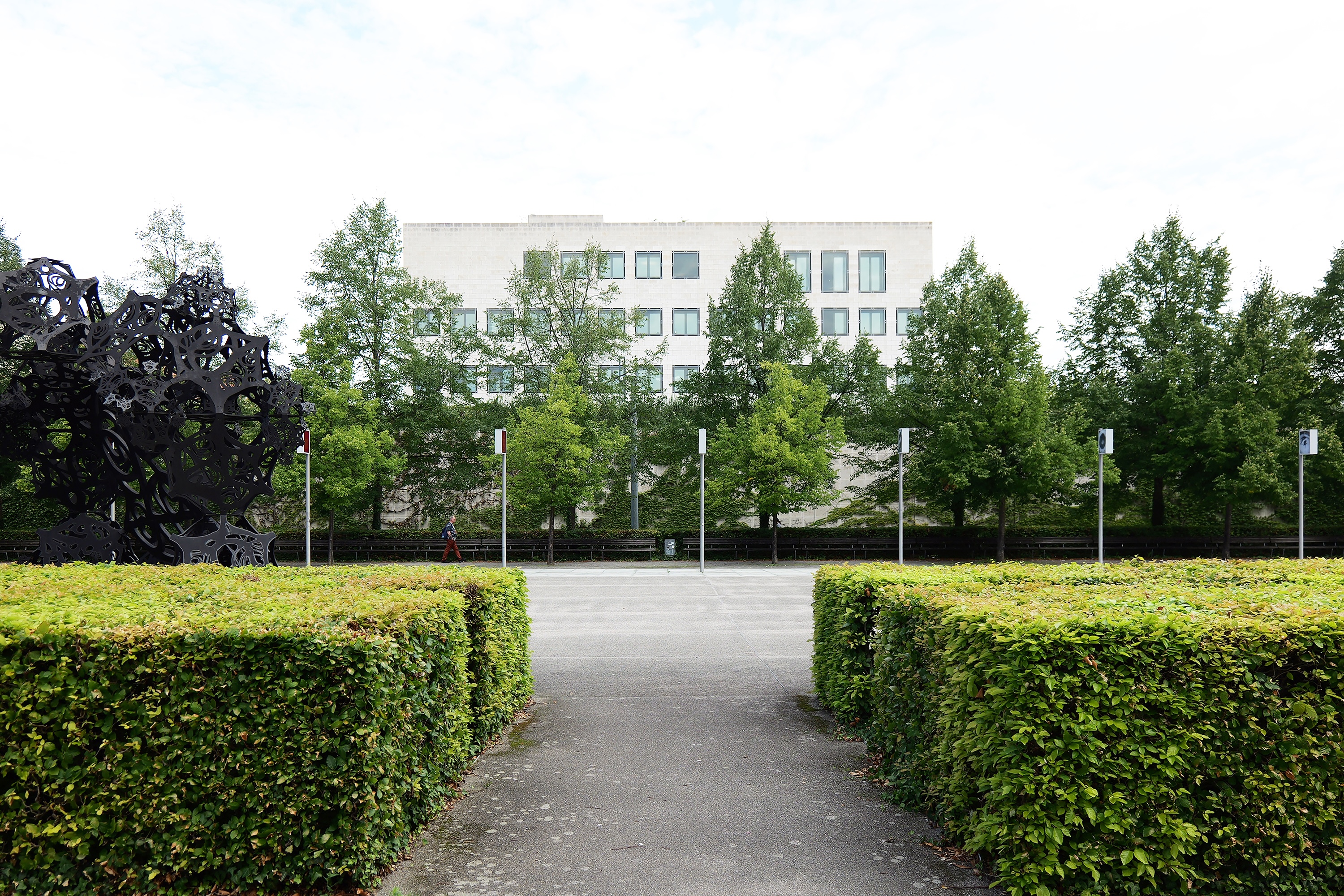 Der Neubau für den Generalbundesanwalt entstand 1994–1998 auf dem ehemaligen DWM-Areal, heute im Umfeld des ZKM. Ungers ordnete den Komplex als Stadtpalais: Mauer und Torbauten rahmen den Zugang, dahinter erschließt eine klare Achse den Hof; zentral steht die konkav geschwungene, regelmäßig gefensterte Hauptfassade. Die Strenge ist gewollt – Geometrie als Ordnung, Maß als Haltung. Zum Gebäude gehören „Kunst am Bau“-Arbeiten; der Vorbereich greift als „Palaisgarten“ die Geometrie des Hauses auf.