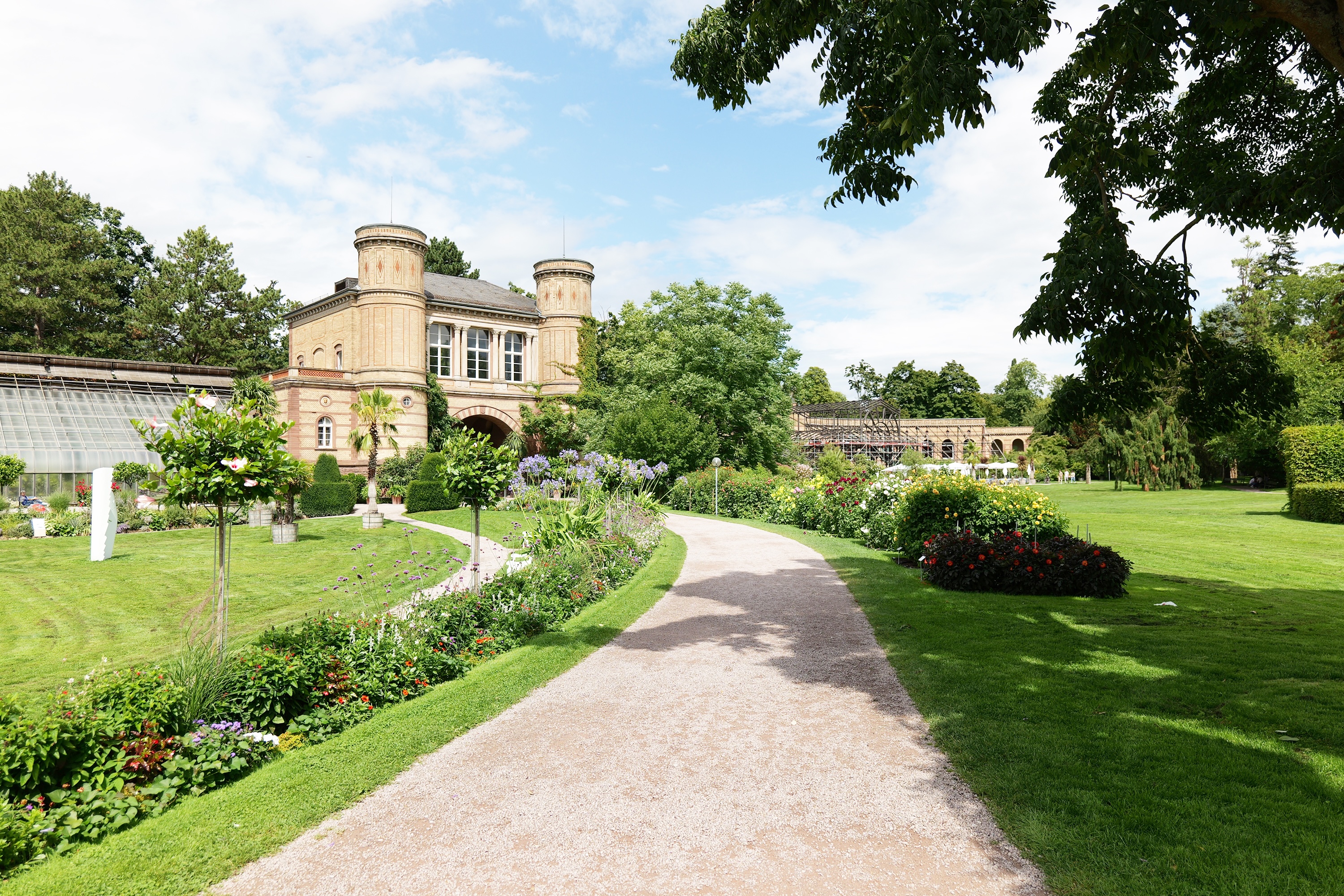 GER. Karlsruhe. Die Orangerie am Botanischen Garten ist ein Schlüsselbau von Heinrich Hübsch: zwischen 1853 und 1857 als Winterquartier für Zitruspflanzen errichtet, mit langem Mittelbau, Rundbogenfenstern und der kuppelbedeckten Rotunde als markantem Abschluss. Heute gehört sie zur Staatlichen Kunsthalle Karlsruhe und dient als Ausstellungsort – nach der Wiedereröffnung wird sie dauerhaft für Sonderausstellungen genutzt. Zum Garten-Ensemble von Hübsch zählen außerdem Gewächs- und Schauhäuser, Tor- und Nebenbauten; sie prägen bis heute das Zusammenspiel von Architektur und Gartenraum. An den Portalen der Orangerie verweisen Jahreszeiten-Figuren von Franz Xaver Reich auf die historische Nutzung.